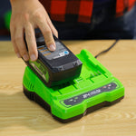 The Greenworks G24X2UC2 2A charger features dual slots with the ability to charge 2 batteries at the same time, as well as integrated battery cooling and charge status indicator LED.